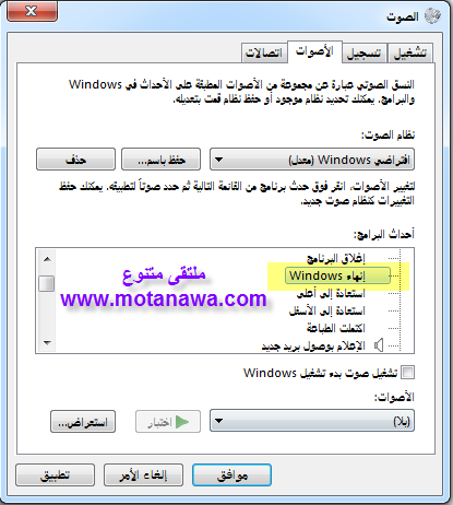 السلام عليكم ورحمة الله وبركاته طريقة أطفاء الموسيقى للويندوز 7 أذهب إلى (ابدأ) ثم (لوحة التحكم) وثم (الصوت) أختر (الأصوات) ثم أتبع الصور الشرح ![]() ![]() ![]() ![]()